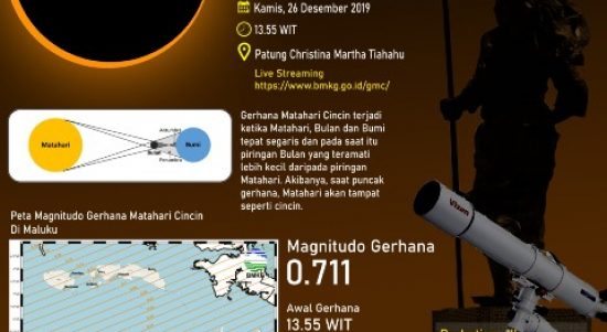 AMBON – Masyarakat di sejumlah wilayah Indonesia bisa menyaksikan fenomena Gerhana Matahari Cincin pada 26 Desember 2019 mendatang. Gerhana Matahari Cincin bakal bisa terlihat di 7 provinsi di Indonesia. Sayangnya wilayah Maluku tidak dapat menikmati fenomena alam Gerhana Matahari Cincin tersebut. Akan tetapi, masyarakat tak perlu gigit jari karena masih bisa melihat fenomena Gerhana Matahari … Lanjutkan membaca 26 Desember 2019, 3 Jam Gerhana Matahari Lintasi Maluku