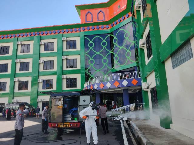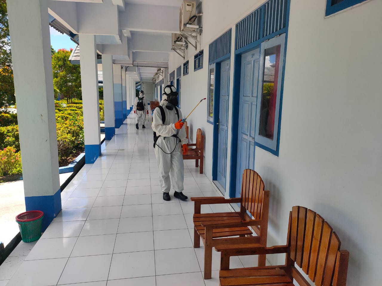 AMBON - Satuan Brimob Polda Maluku terus melakukan sterilisasi dengan penyemprotan disinfektan di sejumlah tempat karantina di Kota Ambon guna mencegah penyebaran Covid-19, Rabu (22/4/2020).
