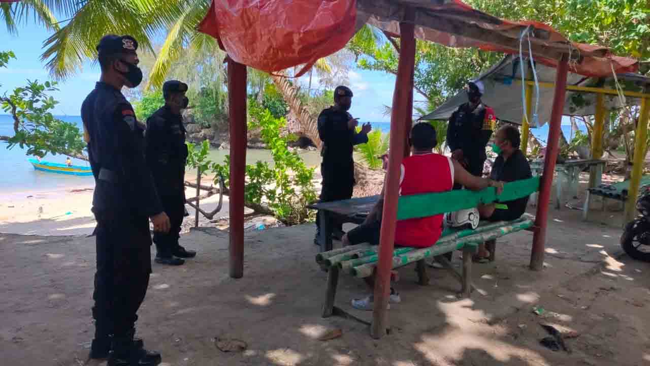 AMBON – Personel Kompi 2 Batalyon C Pelopor Satuan Brimob Polda Maluku mengajak pengunjung kawasan wisata Pantai Batu Kora di Desa Wangel Kabupaten Kepulauan Aru untuk menerapkan protokol kesehatan.