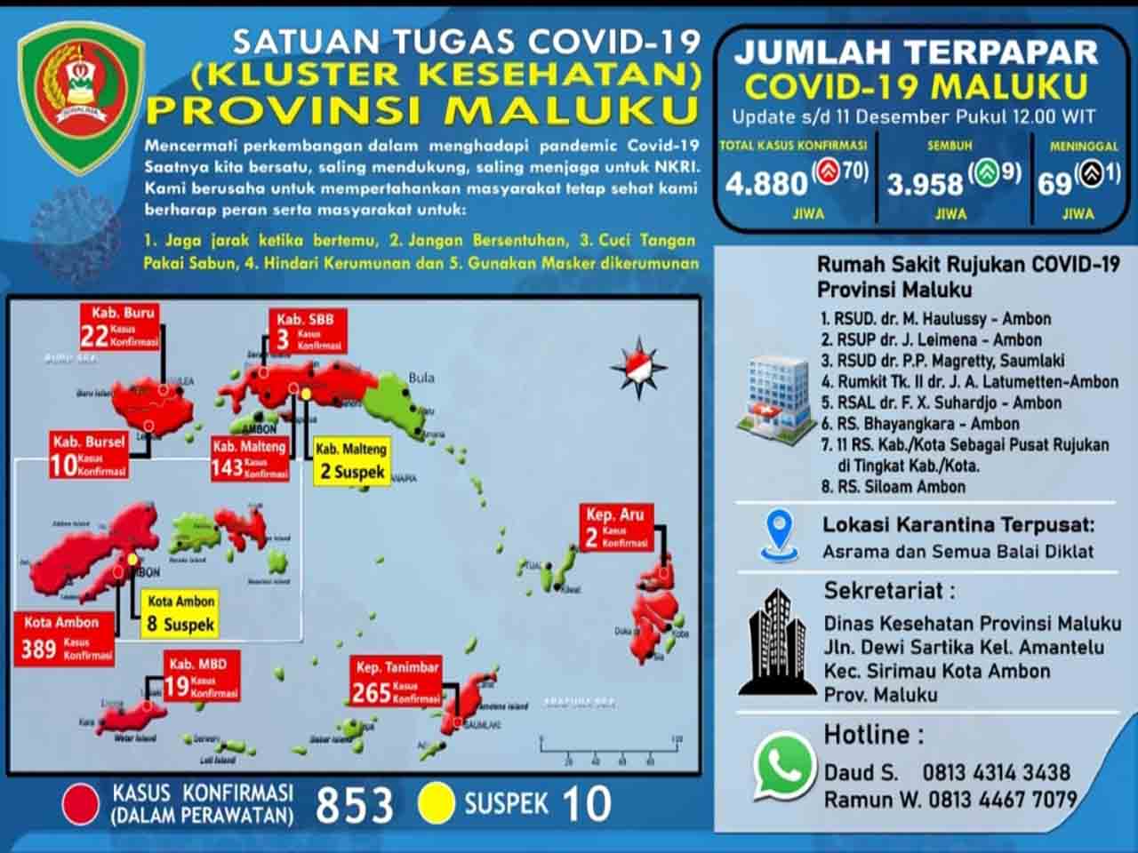 AMBON – Satuan Tugas Percepatan Penanganan Covid-19 Provinsi Maluku mencatat hari ini Jumat (11/12/2020), total kasus terkonfirmasi positif bertambah 70 kasus.
