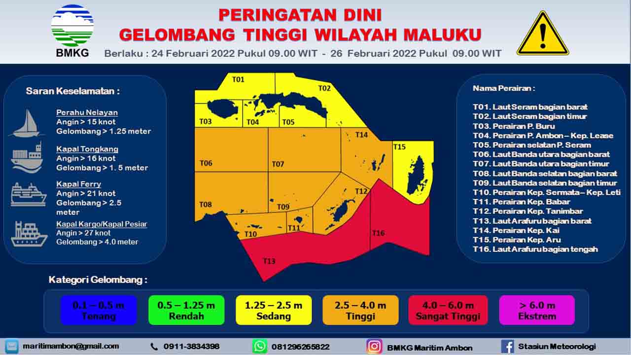 "Peringatan dini gelombang tinggi berlaku tanggal 24 Februari 2022 pukul 09.00 WIT – 25 Februari 2022 pukul 09.00 WIT," jelas Kepala Stasiun Meteorologi Maritim Ambon, Ashar dalam keterangan tertulisnya, Kamis (25/2/2022).