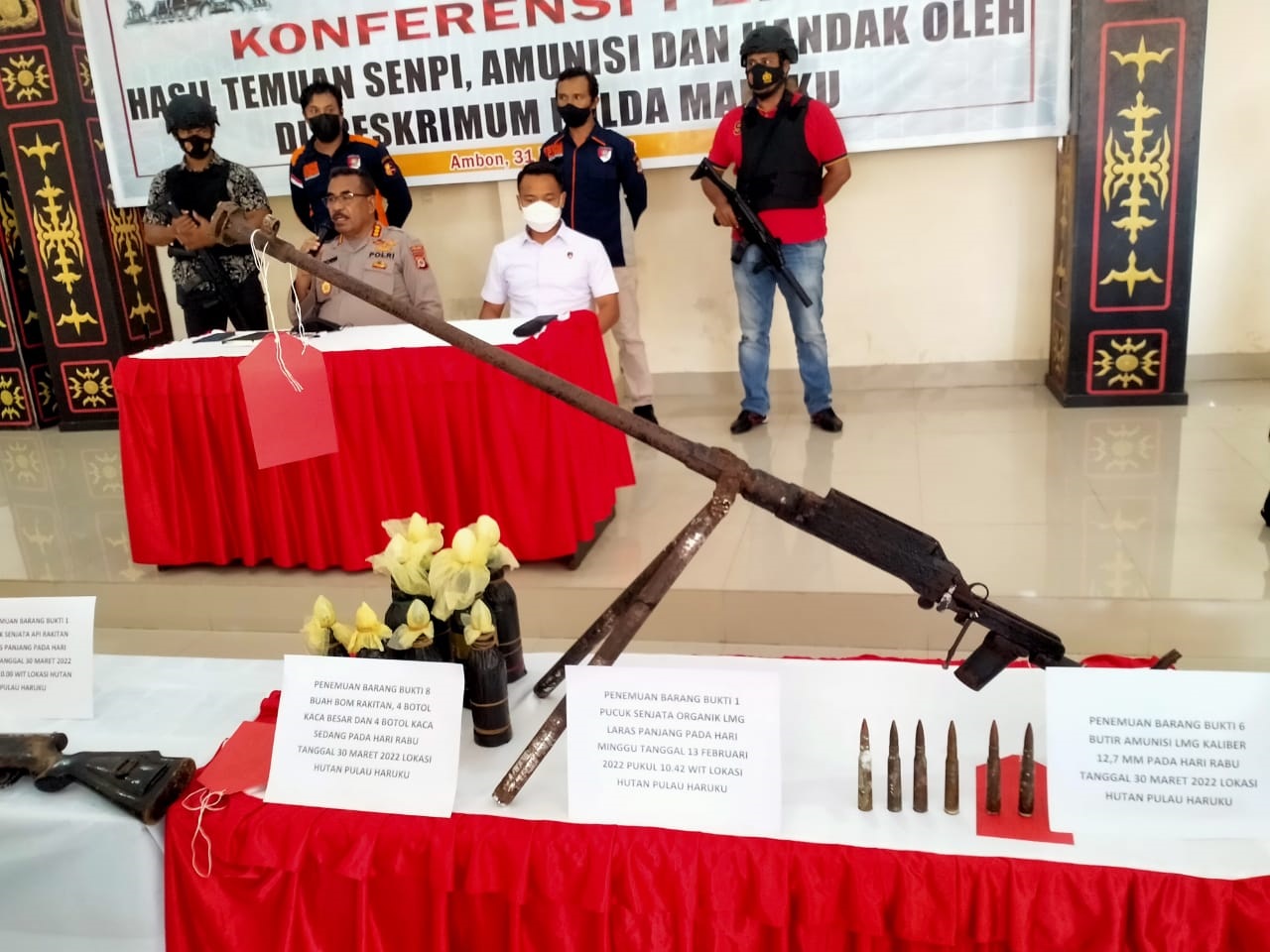 Direskrimum Polda Maluku, Kombes Pol Andri Iskandar didampingi Kabid Humas Polda Maluku, Kombes Pol M Roem Ohoirat di Mapolda Maluku, Kamis (31/3/2022) menjelaskan, tiga pucuk pucuk senjata api, satu diantaranya senjata organik dan dua senjata api rakitan.