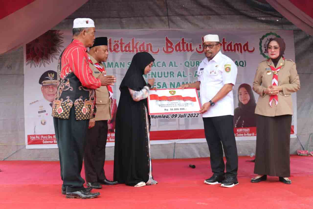 Usai peletakan batu pertama, pemerintah provinsi melalui Gubernur menyerahkan bantuan dana untuk pembangunan Gedung Taman Seni Baca Al-Qur'an (Tasbaq) An-Nur Al-Adli dan Asrama Santri, Desa Namlea, Kabupaten Buru, senilai Rp. 50 juta.