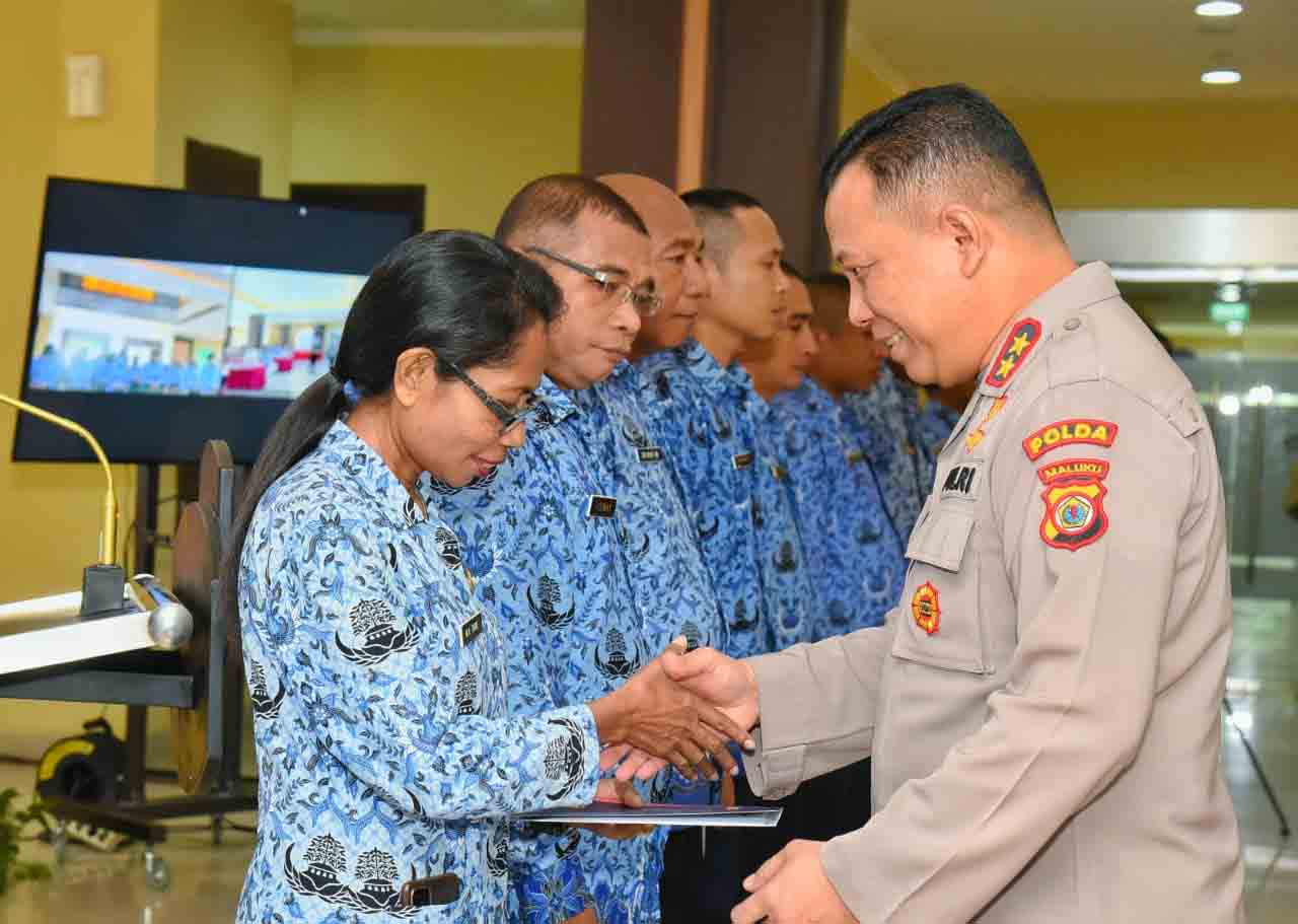 Selain itu, Kapolda Maluku juga memberikan penghargaan kepada 10 PNS Polri atas dedikasi terbaik yang diberikan selama bertugas di satker Polda Maluku.