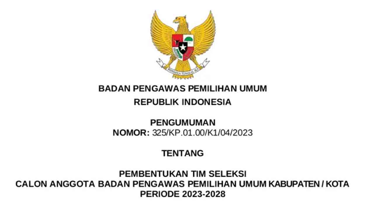 Penetapan timsel ini berdasarkan Pengumuman Bawaslu RI nomor 325/KP.01.00/K1/04/2024 tentang Pembentukan Tim Seleksi Calon Anggota Bawaslu Kabupaten/Kota Periode 2023-2028 yang ditandatangani oleh Ketua Bawaslu Rahmat Bagja tertanggal 19 April 2023.