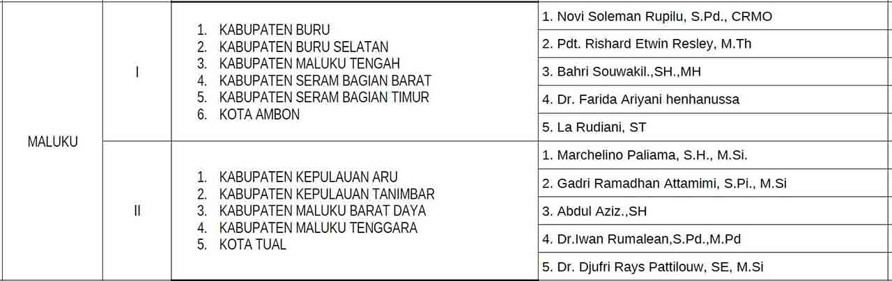 Sementara untuk Kabupaten Kepulauan Aru, Kepulauan Tanimbar, Maluku Barat Daya, Maluku Tenggara dan Kota Tual dilakuka oleh Marchelino Paliama, Gadri Ramadhan Attamimi, Abdul Aziz, Iwan Rumalean dan Djufri Rays Pattilouw.
