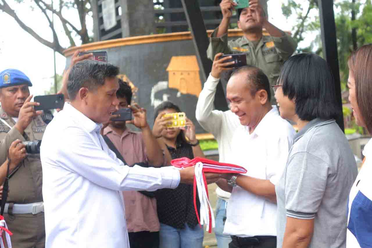 AMBON, MalukuTerkini,com - Penjabat Wali Kota Ambon Bodewin Wattimena mencanangkan Gerakan Pembagian Bendera Merah Putih di Pattimura Park, Ambon, Rabu (19/7/2023).