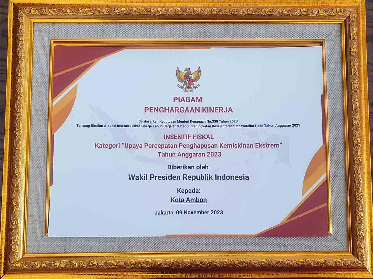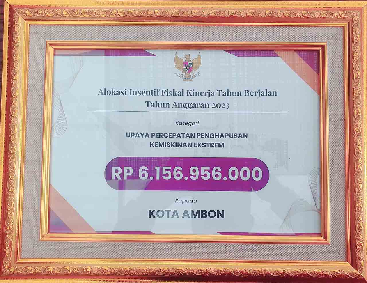 AMBON, MalukuTerkini.com – Pemerintah Kota (Pemkot) Ambon menerima penghargaan berupa Alokasi Insentif Fiskal Tahun Berjalan 2023 dari Pemerintah Pusat atas keberhasilan dalam upaya percepatan penghapusan kemiskinan ekstrem.