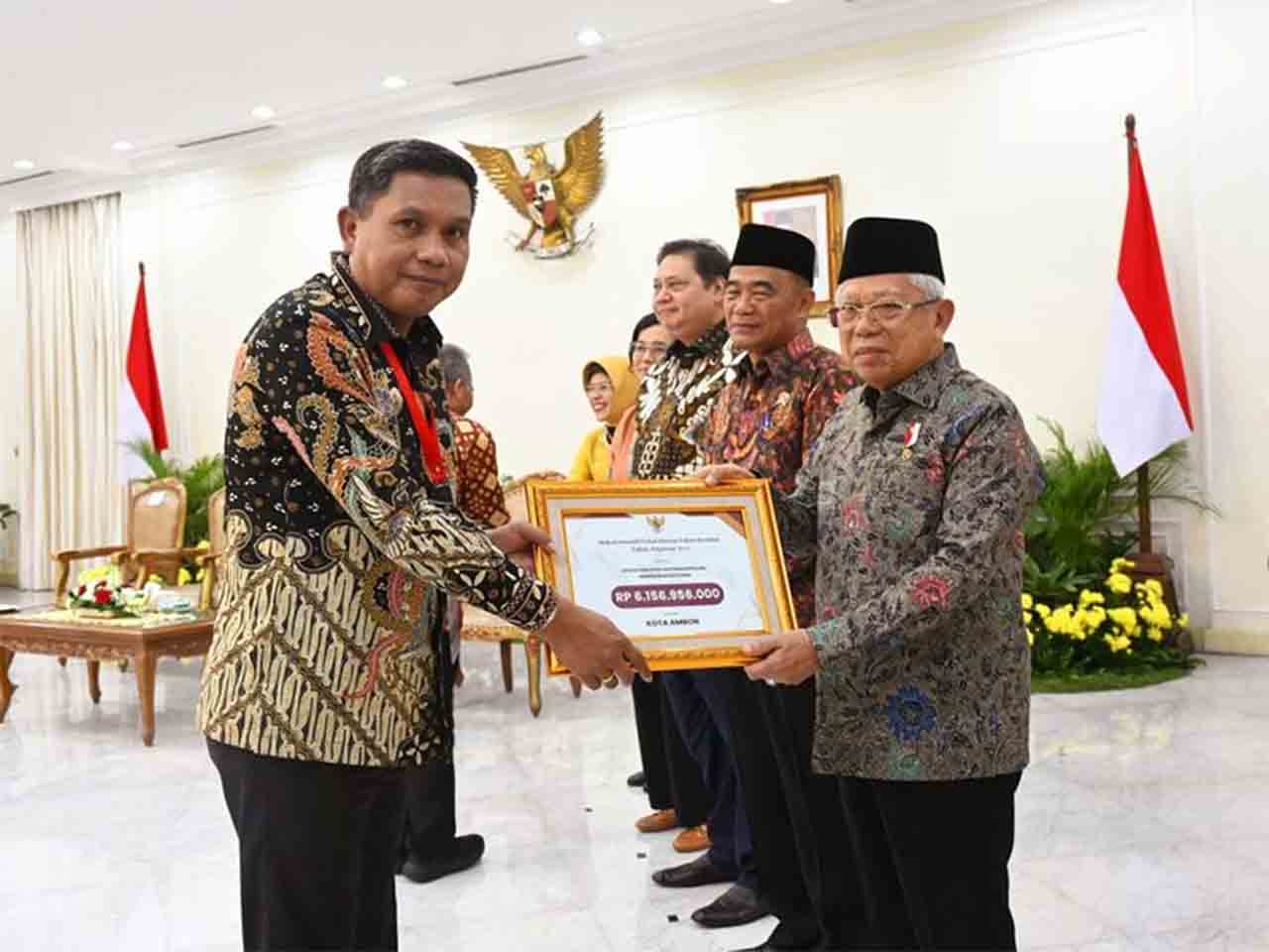 Piagam penghargaan Alokasi Insentif Fiskal dengan nilai Rp 6.156.956.000 tersebut diserahkan langsung oleh Wakil Presiden (Wapres ), KH Ma'ruf Amin dan diterima Penjabat Wali Kota Ambon Bodewin Wattimena, dalam Rapat Koordinasi Nasional yang digelar di Istana Wapres, Jakarta, Jumat (9/11/2023)