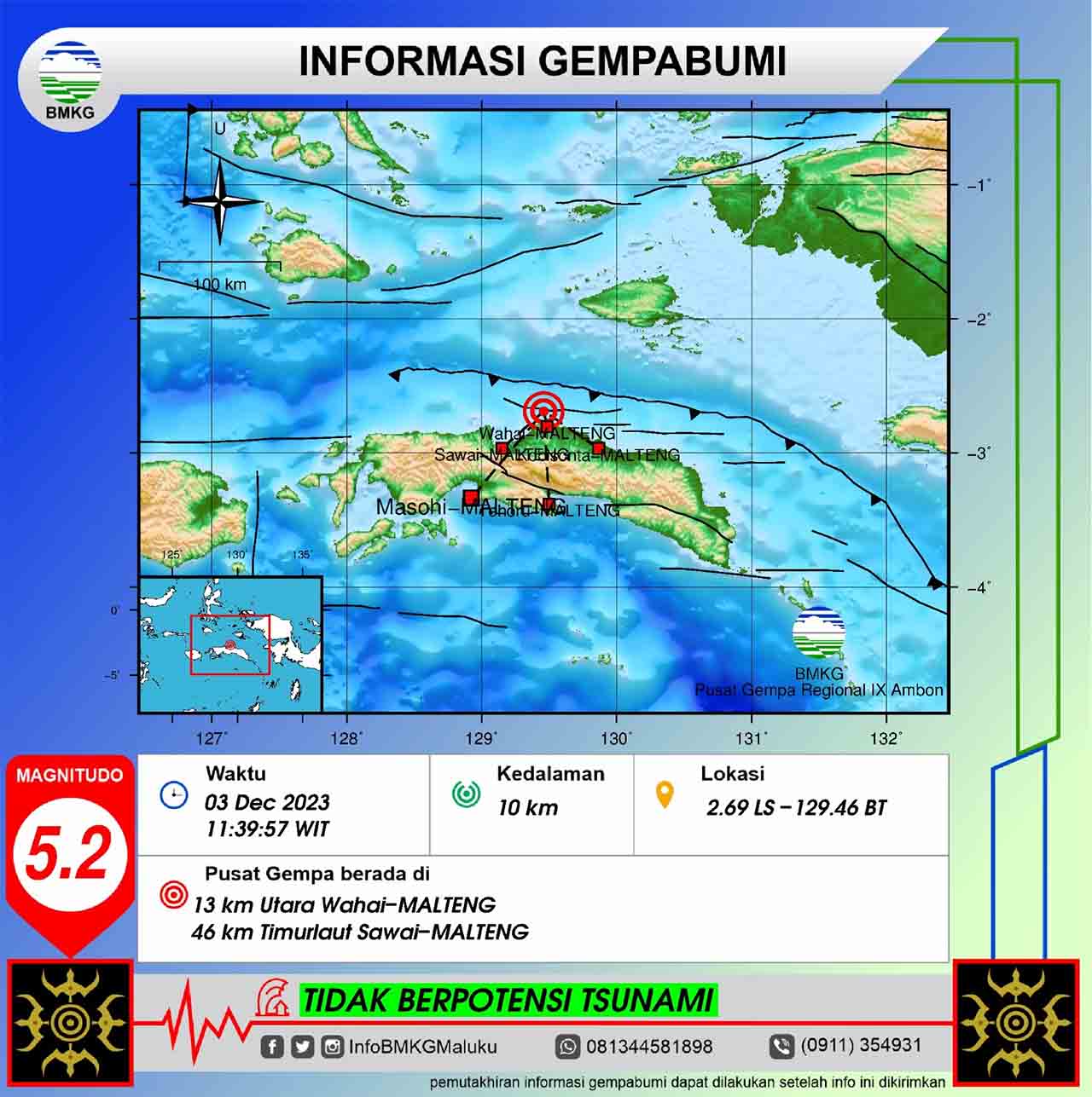 AMBON, MalukuTerkini.com – Gempa bumi tektonik berkekuatan magnitudo M 5,2 terjadi di wilayah Seram Utara, Kabupaten Maluku Tengah, Provinsi Maluku, Minggu (3/12/2023) pukul 11.39 WIT.