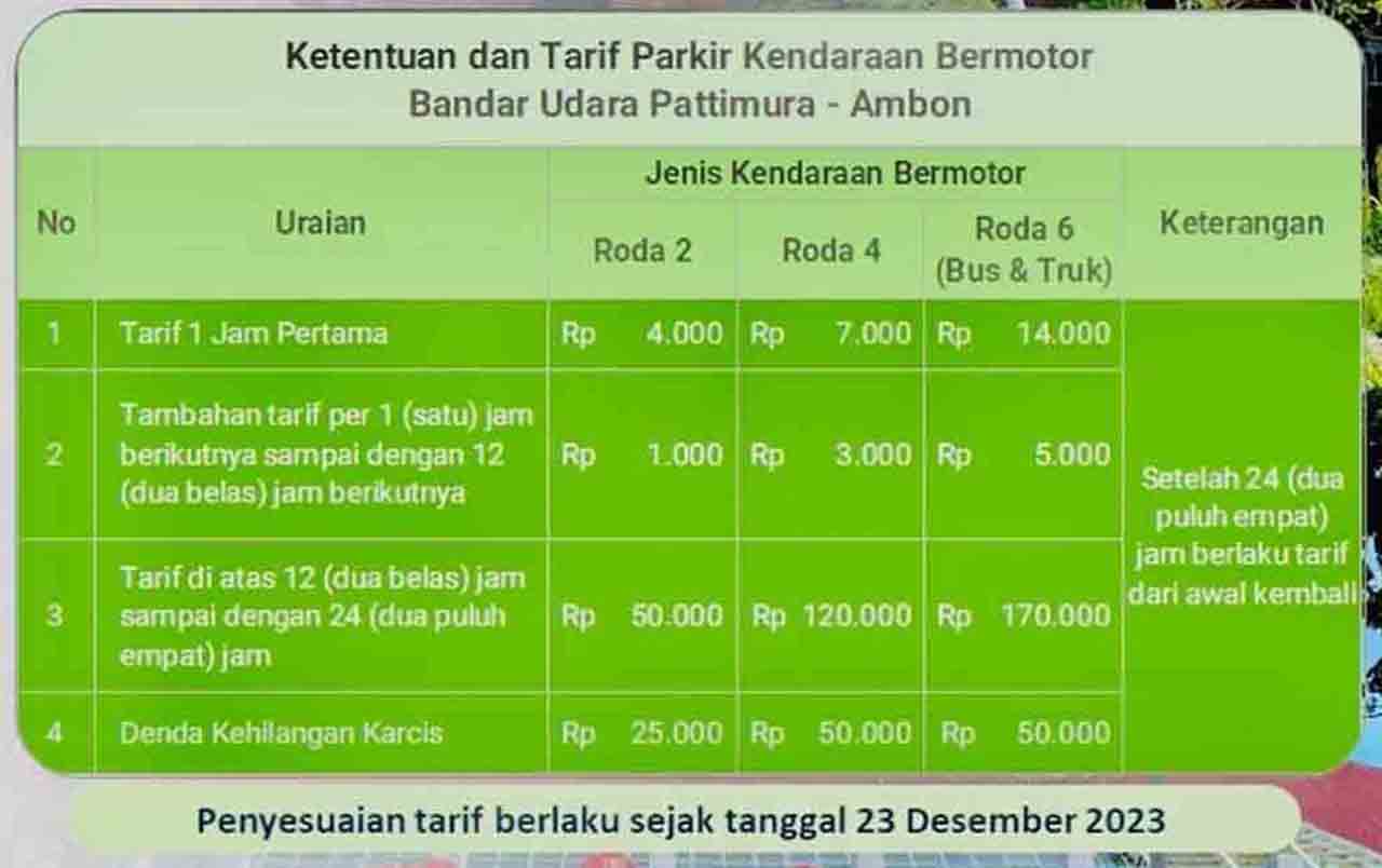"Iya benar, kita telah melakukan penyesuaian kenaikan tarif parkir di Bandara Pattimura. Tarif baru itu itu sudah diberlakukan sejak 23 Desember 2023," jelas Legal, Compliance and Stakeholder Relation Manager PT Angkasa Pura I Cabang Bandara Pattimura Ambon, Atifatul Ismi kepada malukuterkini.com, Selasa (26/12/2023).