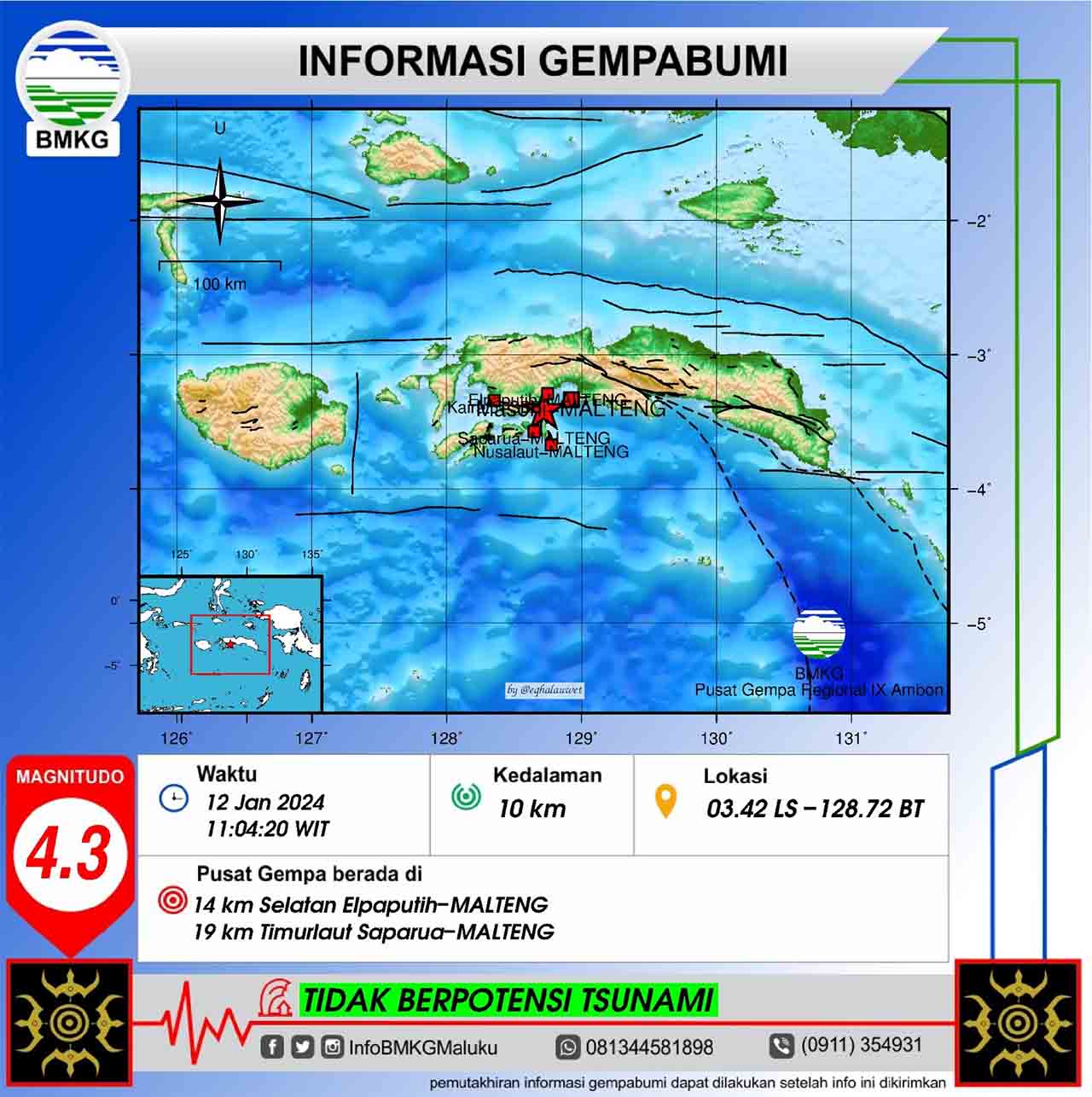 AMBON, MalukuTerkini.com – Gempa bumi tektonik berkekuatan magnitudo M 4,3 mengguncang wilayah Kairatu, Kabupaten Seram Bagian Barat, Provinsi Maluku, Jumat (12/1/2024) pukul 11.04 WIT.