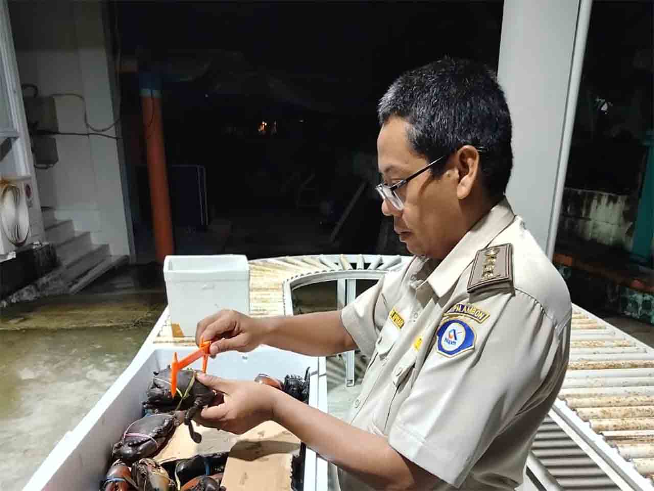 Dandy, Pejabat Karantina Ikan BKHIT Maluku yang bertugas, melakukan pemeriksaan fisik baik kesehatan, jumlah, jenis, dan ukuran media pembawa di tempat pemeriksaan fisik Kepiting Bakau Hidup sebelum dibawa ke terminal kargo untuk diberangkatkan.