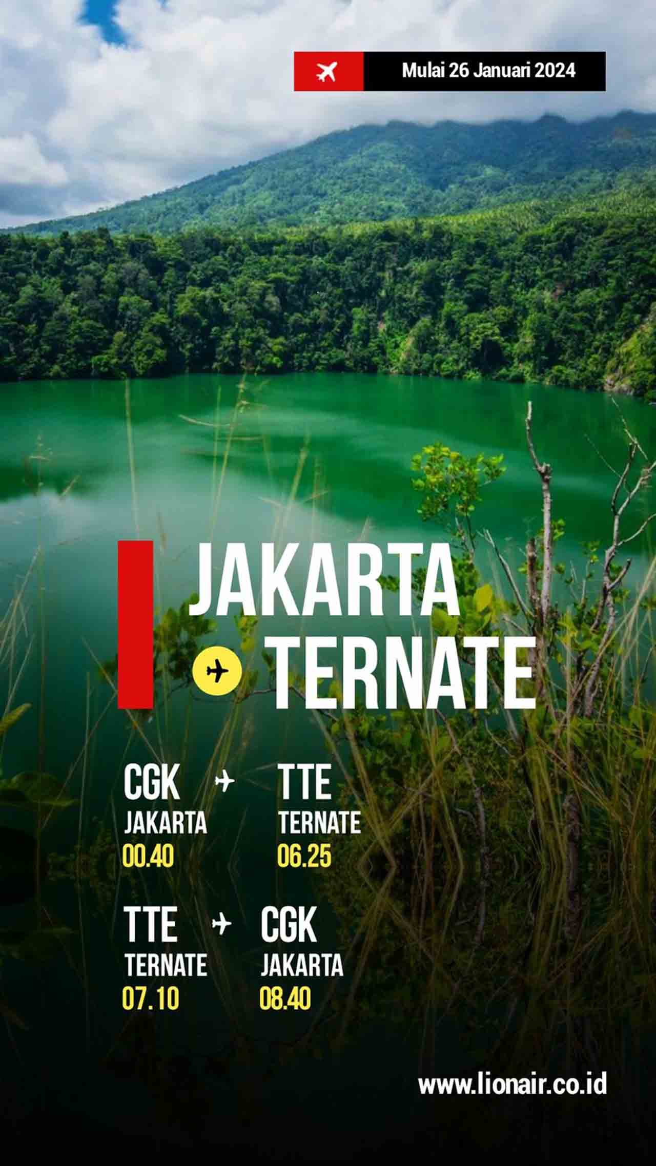 AMBON, MalukuTerkini.com - Maskapai Lion Air member of Lion Group mengumumkan pembukaan rute baru non-stop Jakarta ke Ternate (Maluku Utara), sebagai bagian mendukung program explore #DiIndonesiaAja.
