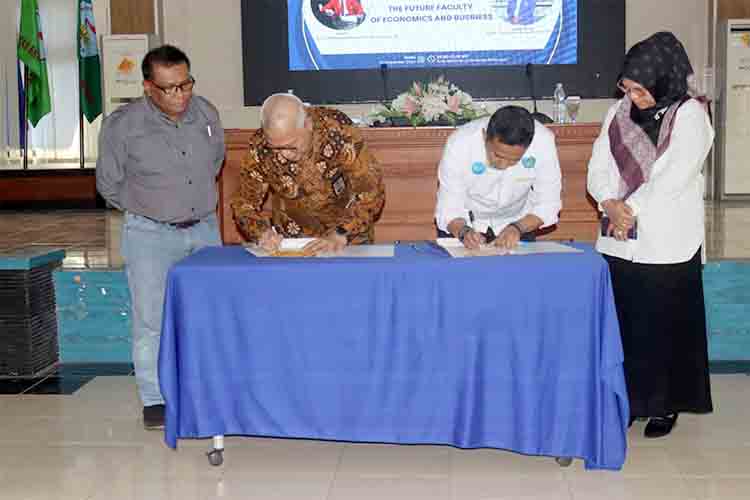 Penandatanganan Perjanjian Kerja Sama dilakukan oleh Dekan FEB Unpatti Teddy Christianto Leasiwal dan Dekan FEB Unhas Abdul Rahman Kadir disela-sela Kuliah Umum bertajuk “The Future Faculty of Economics and Business” yang digelar di Gedung Rektorat Unpatti, Senin (2/12/2024).