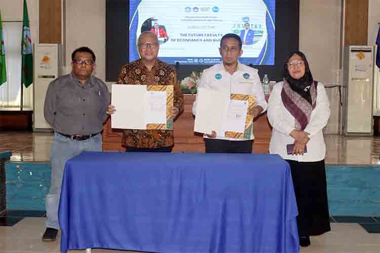 Penandatanganan Perjanjian Kerja Sama dilakukan oleh Dekan FEB Unpatti Teddy Christianto Leasiwal dan Dekan FEB Unhas Abdul Rahman Kadir disela-sela Kuliah Umum bertajuk “The Future Faculty of Economics and Business” yang digelar di Gedung Rektorat Unpatti, Senin (2/12/2024).
