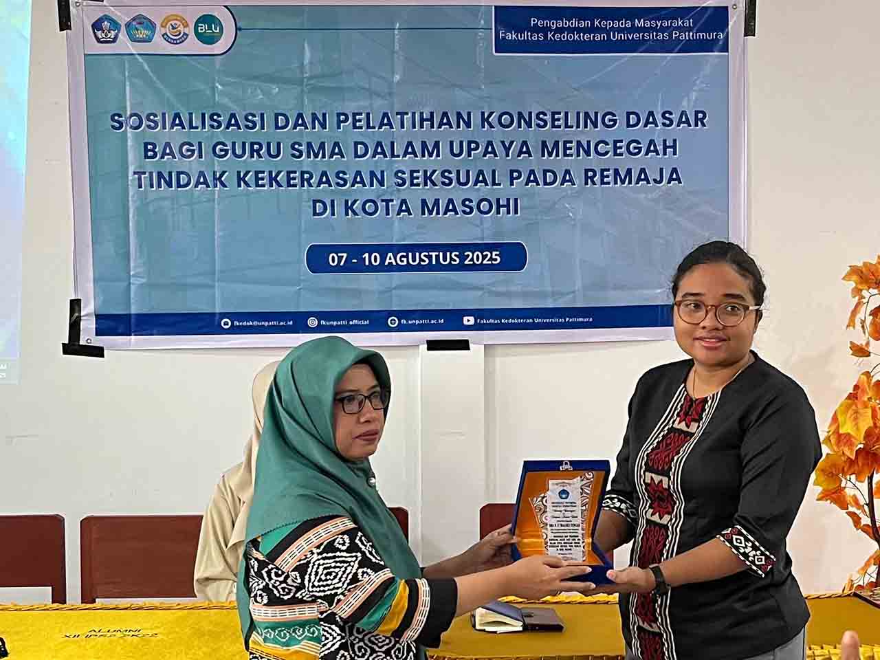 “Pengabdian masyaraka dilaksanakan dalam bentuk sosialisasi tindak kekerasan seksual dari perspektif hukum dan pelatihan konseling dasar bagi guru SMA di Kota Masohi dan sekitarnya yang berlangsung di SMAN 37 Maluku Tengah (Malteng), 8 – 9 Agustus 2025 lalu,” jelas Ketua Tim Pengmas FK Unpatti, Grace Latuheru kepada malukuterkini.com, Senin (22/9/2025).