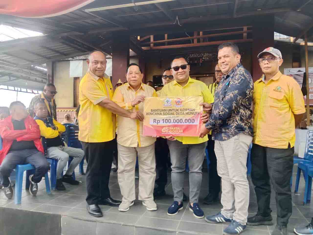 Bantuan sejumlah Rp100 juta diserahkan oleh Ketua DEPIDAR SOKSI Maluku, Rohalim Boy Sangadji kepada Kepala Desa Hunuth Yondri Victor Kappuw di halaman kantor Desa Hunuth Rabu (1/10/2025), dilanjutkan pembagian kepada masing-masing penerima.