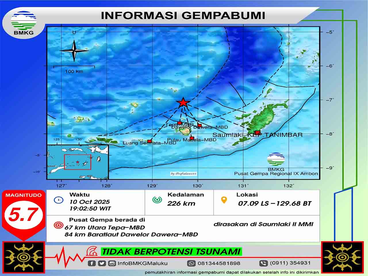 “Hasil analisis BMKG menunjukkan gempa bumi ini memiliki parameter update dengan magnitudo M5,4. Episenter gempabumi terletak pada koordinat 7,27° LS ; 129,66° BT, atau tepatnya berlokasi di laut pada jarak 198 Km arah BaratLaut Tanimbar, Maluku pada kedalaman 169 km,” ungkap Direktur Gempa Bumi dan Tsunami BMKG, Daryono dalam keterangannya yang diterima malukuterkini.com, Jumat (10/10/2025).