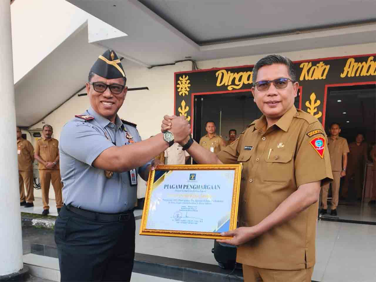 Kepala Kantor Wilayah Kementerian Hukum (Kakanwil Kemenkum) Maluku, Saiful Sahri, menyerahkan penghargaan kepada Wali Kota Ambon Bodewin M Wattimena.