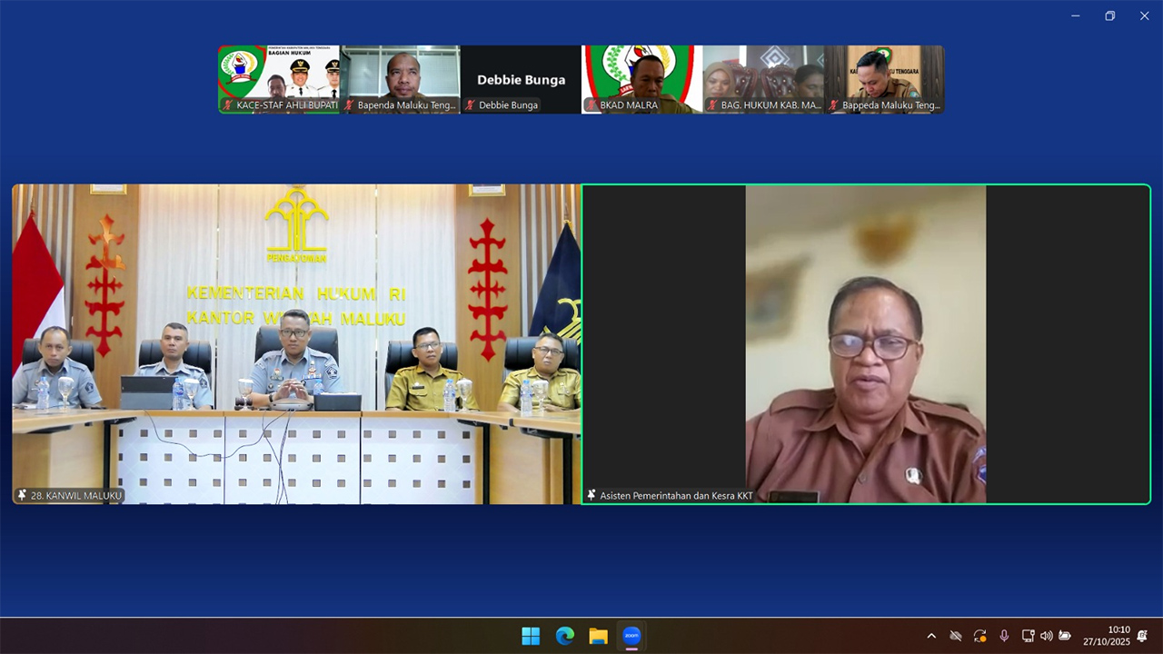 AMBON, MalukuTerkini.com - Kepala Kantor Wilayah Kementerian Hukum (Kakanwil Kemenkum) Maluku, Saiful Sahri, membuka Rapat Pengharmonisasian, Pembulatan, dan Pemantapan Konsepsi Rancangan Peraturan Bupati (Ranperbup) Kabupaten Maluku Tenggara (Malra) dan Kabupaten Kepulauan Tanimbar, Senin (27/10/2025).