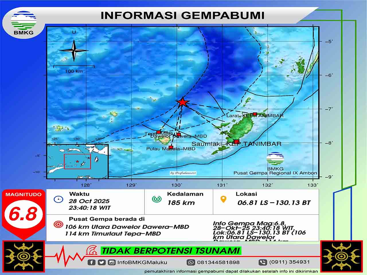 AMBON, MalukuTerkini.com – Gempa bumi tektonik berkekuatan magitudo M6,8 terjadi di wilayah Laut Banda, Maluku, Selasa (28/10/2025) pukul 23.40 WIT.