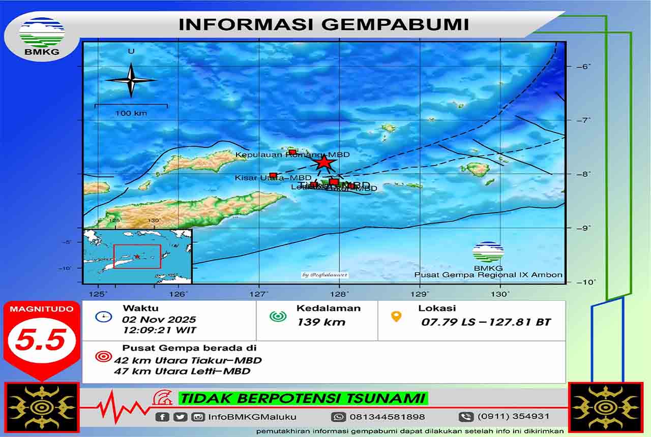 AMBON, MalukuTerkini.com – Gempa bumi tektonik berkekuata magnitudo M5,5 terjadi di Pantai Utara Maluku Barat Daya, Maluku, Minggu (2/11/2025) pukul 12.09 WIT.