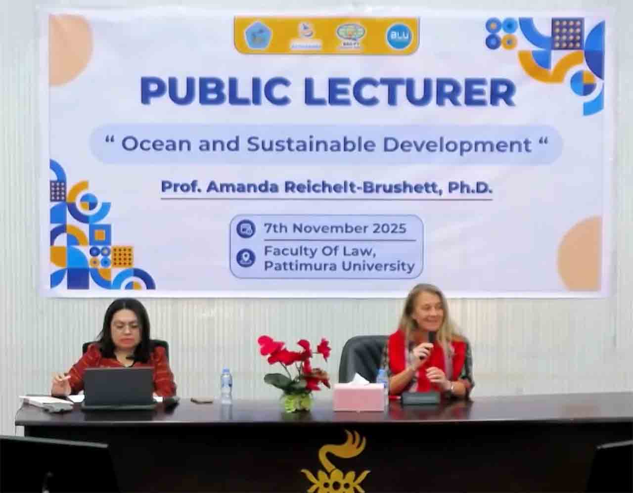 Kuliah Umum bertema ‘Ocean and Sustainable Development’ (Laut dan Pembangunan Berkelanjutan) ini dilaksanakan secara hybrid, yang dipusatkan di Auditorium Fakultas Hukum Unpatti, Ambon, Jumat (7/10/2025).