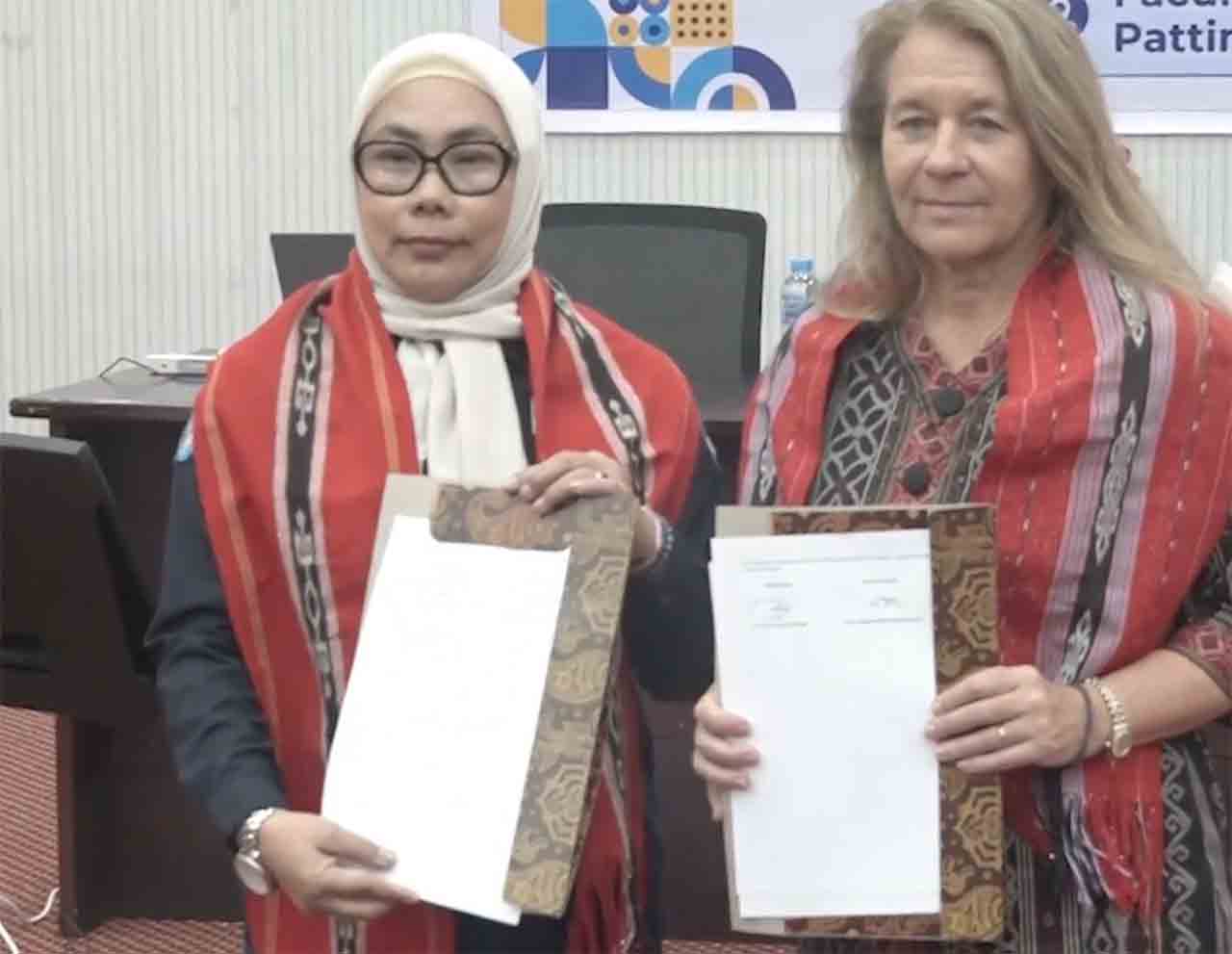 Saat Kuliah Umum tersebut, juga dilakukan penandatanganan kesepakatan kerja sama antara Dr. Irma Hanafi (Ketua Program Studi Ilmu Hukum Unpatti) dengan Prof. Amanda Reichelt-Brushett.