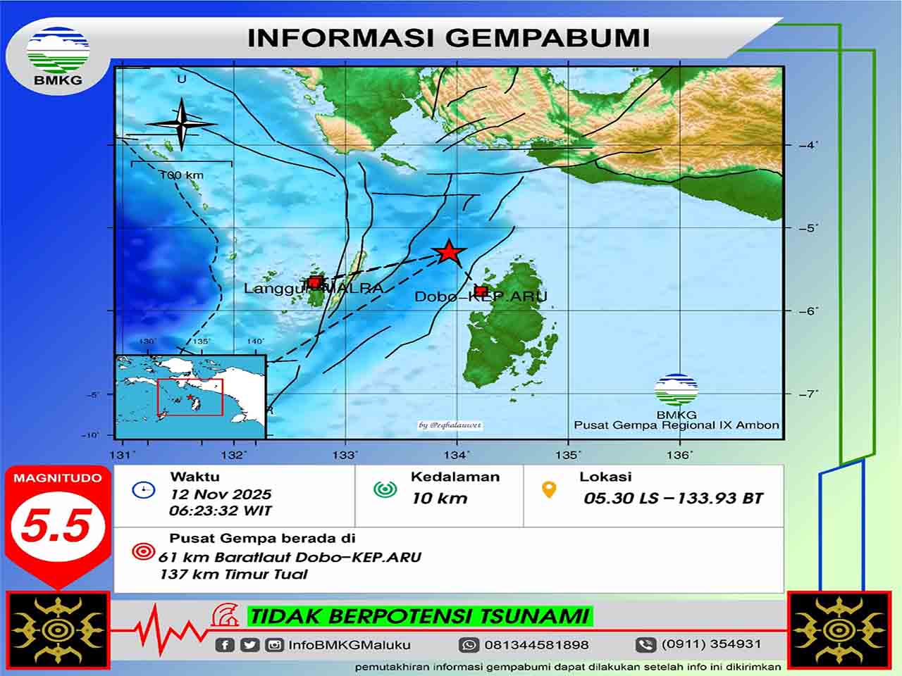 AMBON, MalukuTerkini.com – Gempa bumi tektonik berkekuatan magnitudo M5,5 mengguncang Dobo, Kabupaten Kepulauan Aru, Maluku, Rabu (12/11/2025) pukul 06.23 WIT.