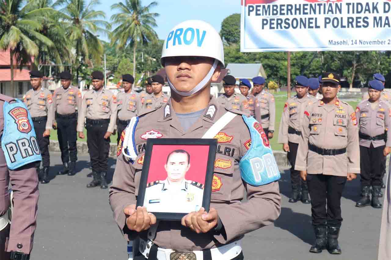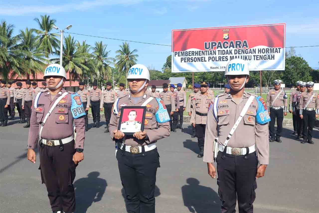 Upacara Pemberhentian Tidak Dengan Hormat (PTDH) terhadap Soplantila dipimpin Kapolres Malteng, AKBP Hardi Meladi Kadir di pelataran Mapolres Malteng, Jumat (14/11/2025).