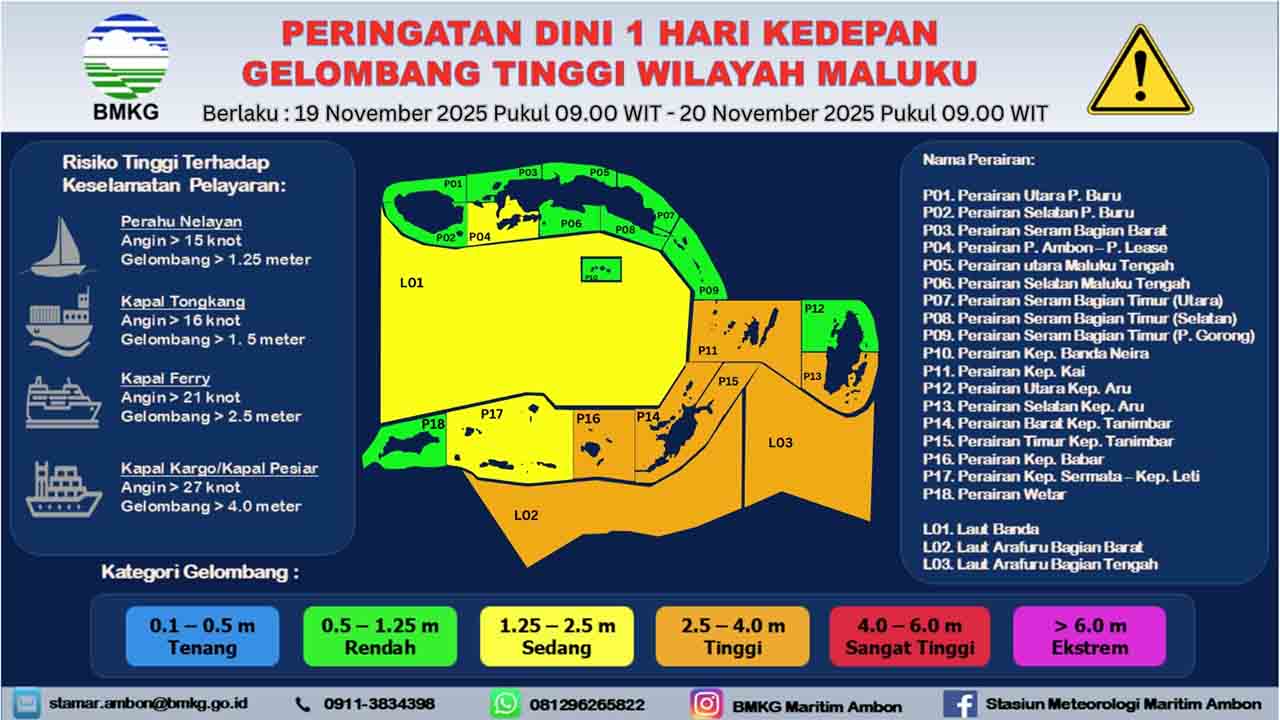 “Peringatan dini gelombang tinggi berlaku 19 November 2025 pukul 09.00 WIT – 20 November 2025 pukul 09.00 WIT,” jelas Kepala Stasiun Meteorologi Maritim Ambon, Mujahidin dalam keterangan tertulisnya, Selasa (18/11//2025).