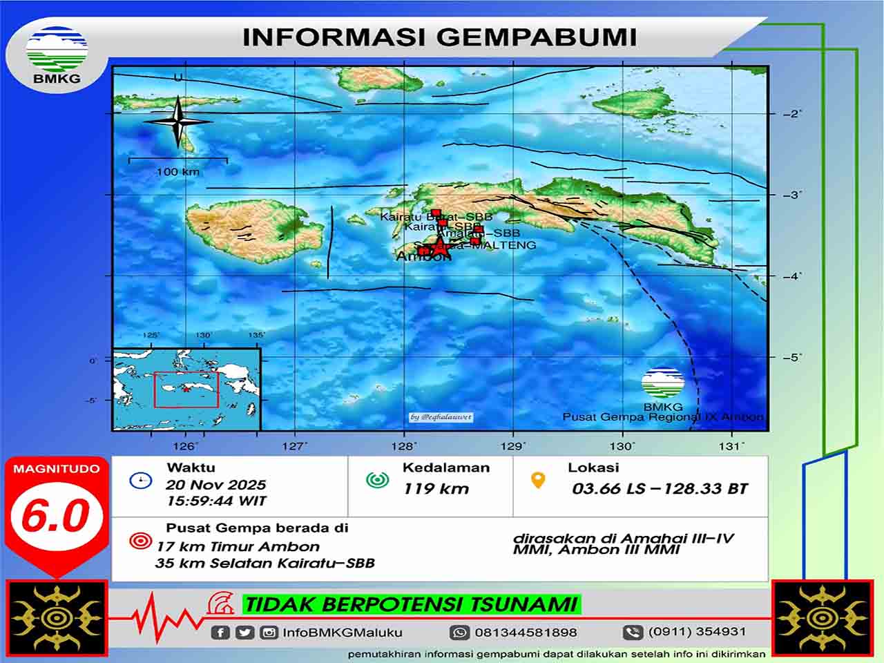 “Hasil analisis BMKG menunjukkan gempa bumi ini memiliki parameter update dengan magnitudo M5,8. Episenter gempa bumi terletak pada koordinat 3,69° LS ; 128,40° BT, atau tepatnya berlokasi di laut pada jarak 23 Km arah Tenggara Ambon, Maluku pada kedalaman 116 km,” ungkap Direktur Gempa Bumi dan Tsunami BMKG, Daryono dalam keterangannya yang diterima malukuterkini.com, Kamis (20/11/2025).