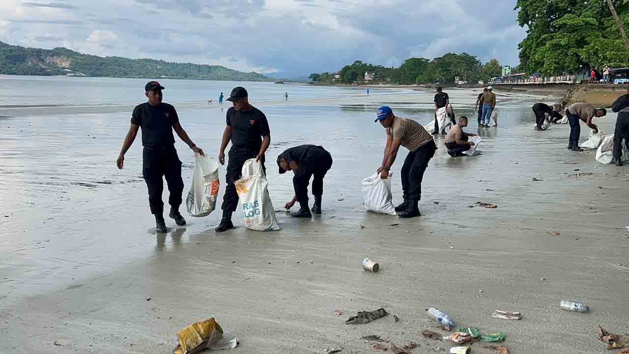Seluruh personel bergotong royong membersihkan sampah, rumput liar, dan kotoran lainnya di sepanjang garis pantai. Ini dilakukan demi menjaga kenyamanan pengunjung dan kelestarian ekosistem laut.