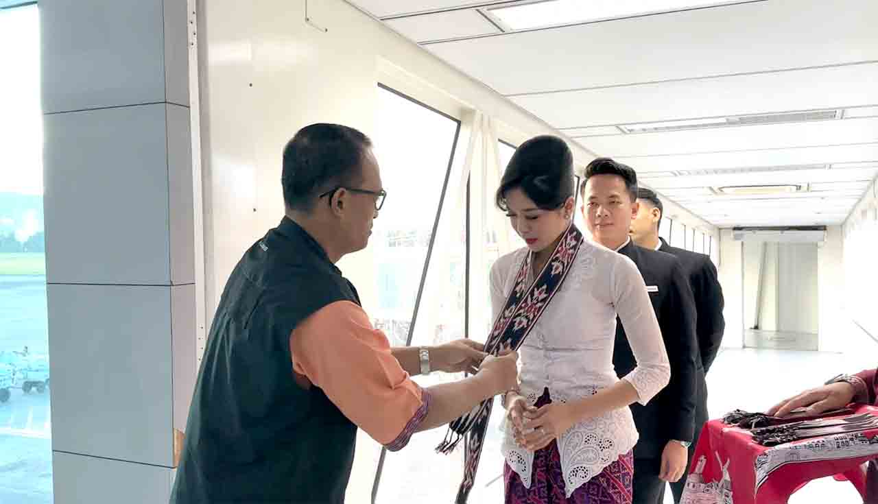 Penumpang pertama maupun crew pesawat disambut dengan pengalungan kain khas Maluku sebagai simbol harapan, doa, dan semangat baru di awal tahun.