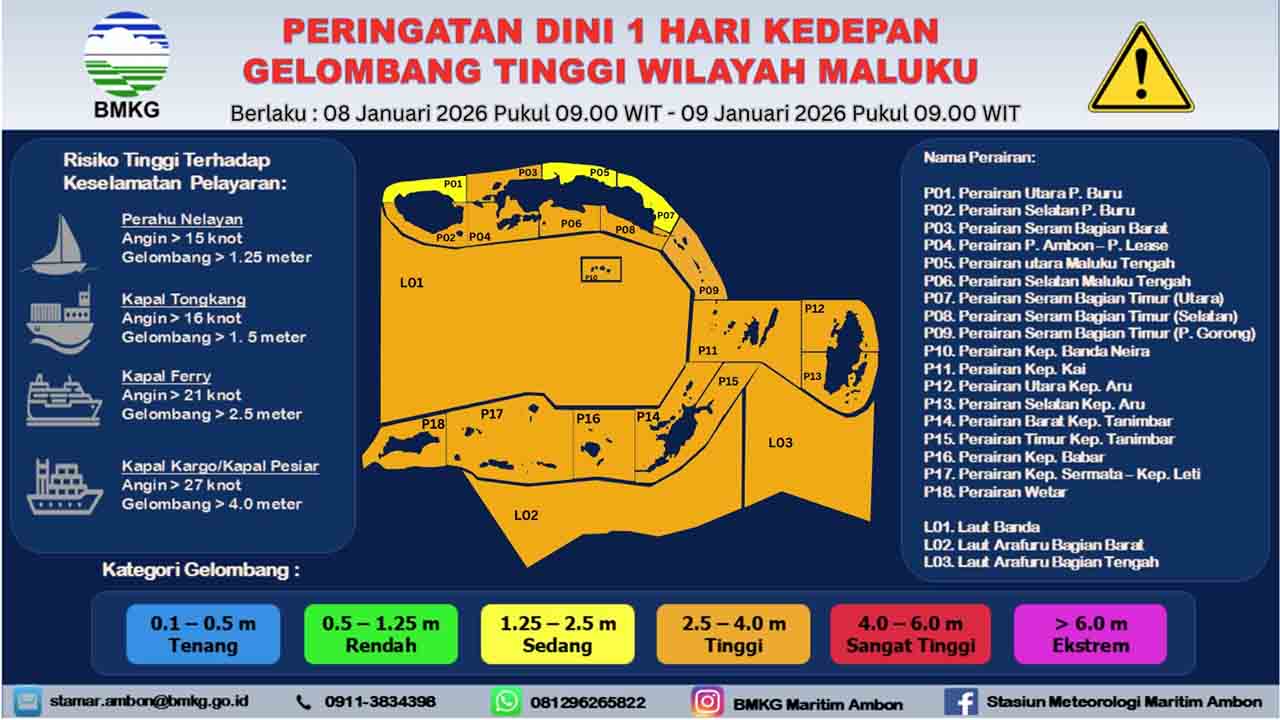 “Peringatan dini gelombang tinggi berlaku tanggal 8 Januari 2026 pukul 09.00 WIT – 9 Januari 2026 pukul 09.00 WIT,” jelas Kepala Stasiun Meteorologi Maritim Ambon, Mujahidin dalam keterangan tertulisnya, Rabu (7/1/2026).