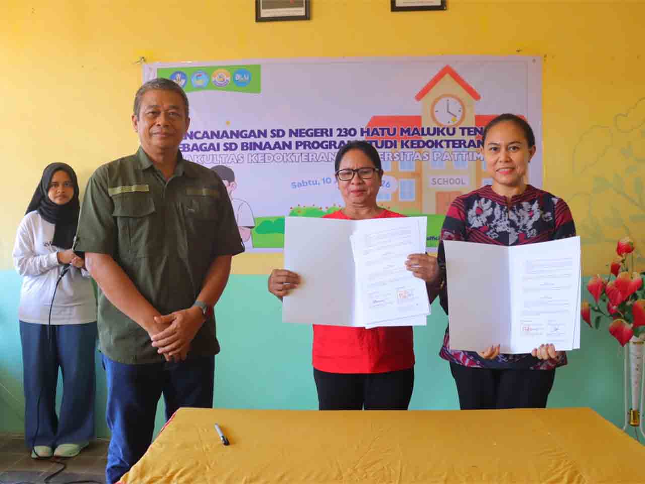 Penandatanganan Memorandum of Understanding (MoU) antara FK Unpatti dan SDN 230 Malteng tentang Sekolah Binaan Program Studi (Prodi) Kedokteran Gigi tersebut ditandatangani oleh Dekan FK Unpatti dr Farah Christina Noya MHPEd PhD dan Kepala SDN 230 Malteng Fransina M Nunumete SPd.