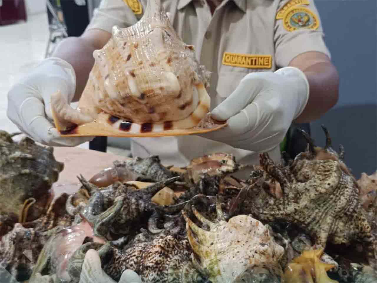 “Didapati sejumlah 50 ekor kerang yang dibungkus dalam satu sak beras, terdiri dari kerang kepala kambing (Cassis cornuta) sebanyak 4 ekor, kerang tedong tedong kaki 5 (Lambis sp) sebanyak 7 ekor, kerang tedong tedong kaki 8 (Lambis sp) sebanyak 35 ekor, serta kerang tiup (Cymbiola sp) sebanyak 4 ekor,” rinci petugas yang melakukan pemeriksaan Arief Darmawan.