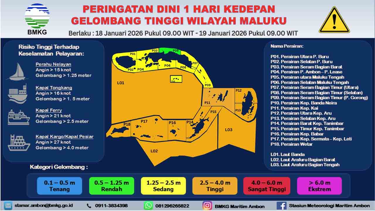 BMKG memprakirakan gelombang tinggi mencapai 4 meter masih berpeluang di hampir seluruh wilayah perairan di Maluku, hari ini Minggu (18/1/2026)  hingga Senin (19/1/2026) besok.