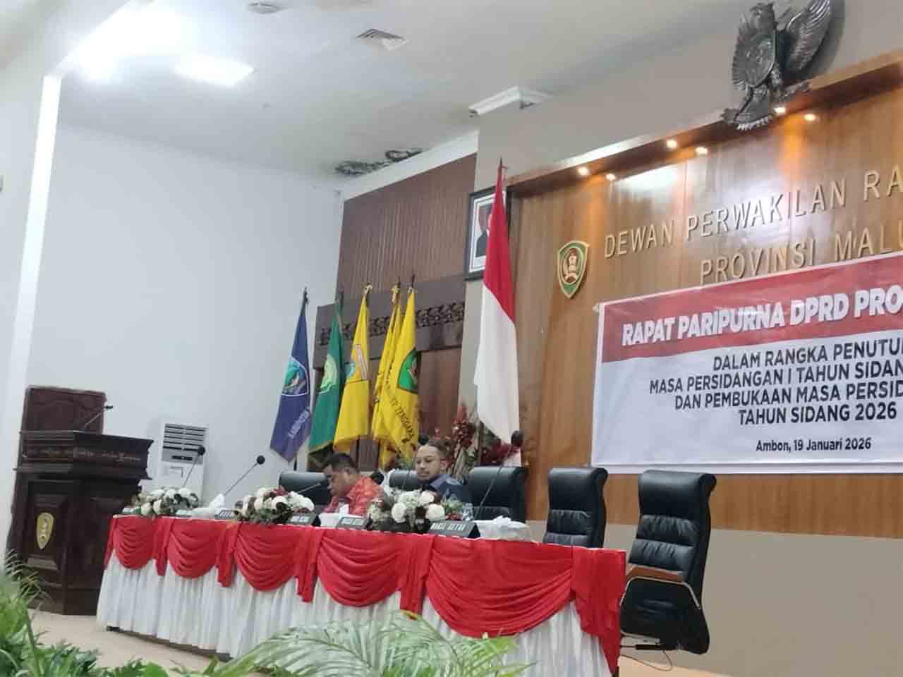 “Maka dengan ini saya menyatakan Penutupan Masa Persidangan I Tahun Sidang 2025–2026 dan Pembukaan Masa Persidangan II Tahun Sidang 2026 dinyatakan ditutup dan dibuka secara resmi,” tandas Rahawarin saat memimpin rapat Rapat Paripurna DPRD Provinsi Maluku dalam rangka penutupan masa persidangan I tahun sidang 2025-2026 dan pembukaan masa persidangan II tahun sidang 2026, di Ruang Paripurna DPRD Maluku, Senin (19/1/2026)