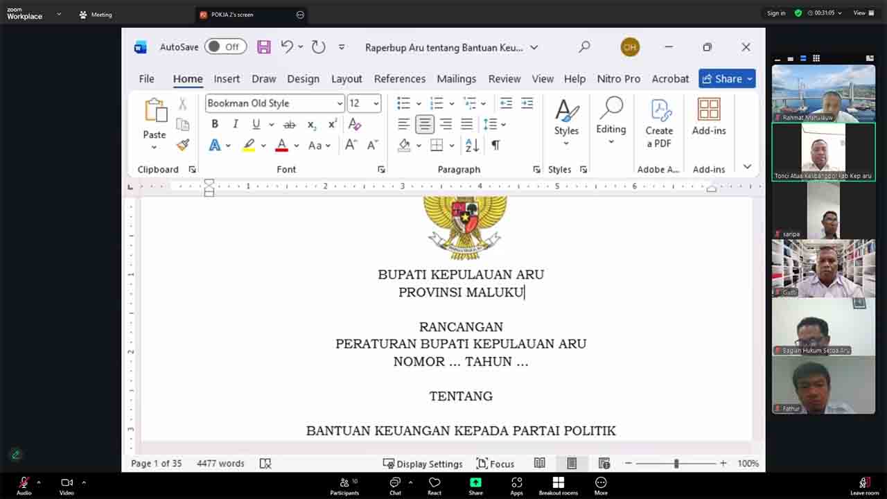 Bertempat di Ruang Harmonisasi II Kantor Wilayah Kementerian Hukum Maluku  Tim Pokja 2 yang dipimpin oleh  Arthur Sahertian membedah secara mendalam Rancangan Peraturan Bupati (Ranperbup) Kepulauan Aru.