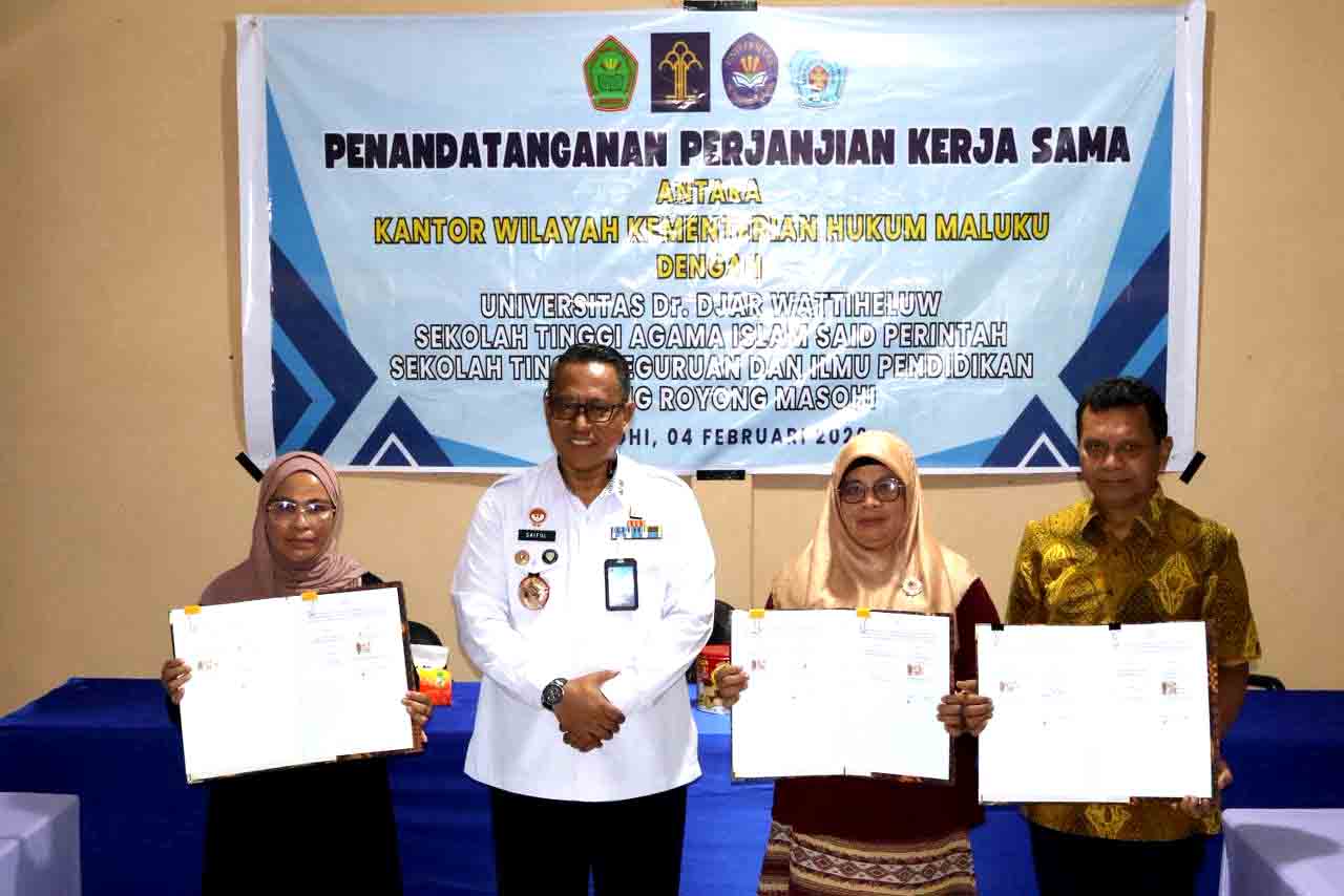 AMBON, MalukuTerkini.com – Dalam upaya merajut sinergi antara dunia akademik dan kepastian hukum, Kantor Wilayah Kementerian Hukum Maluku melaksanakan penandatanganan Perjanjian Kerja Sama Kekayaan Intelektual sekaligus pembentukan Sentra Kekayaan Intelektual bersama tiga perguruan tinggi di Kabupaten Maluku Tengah, Rabu (4/2/2026).