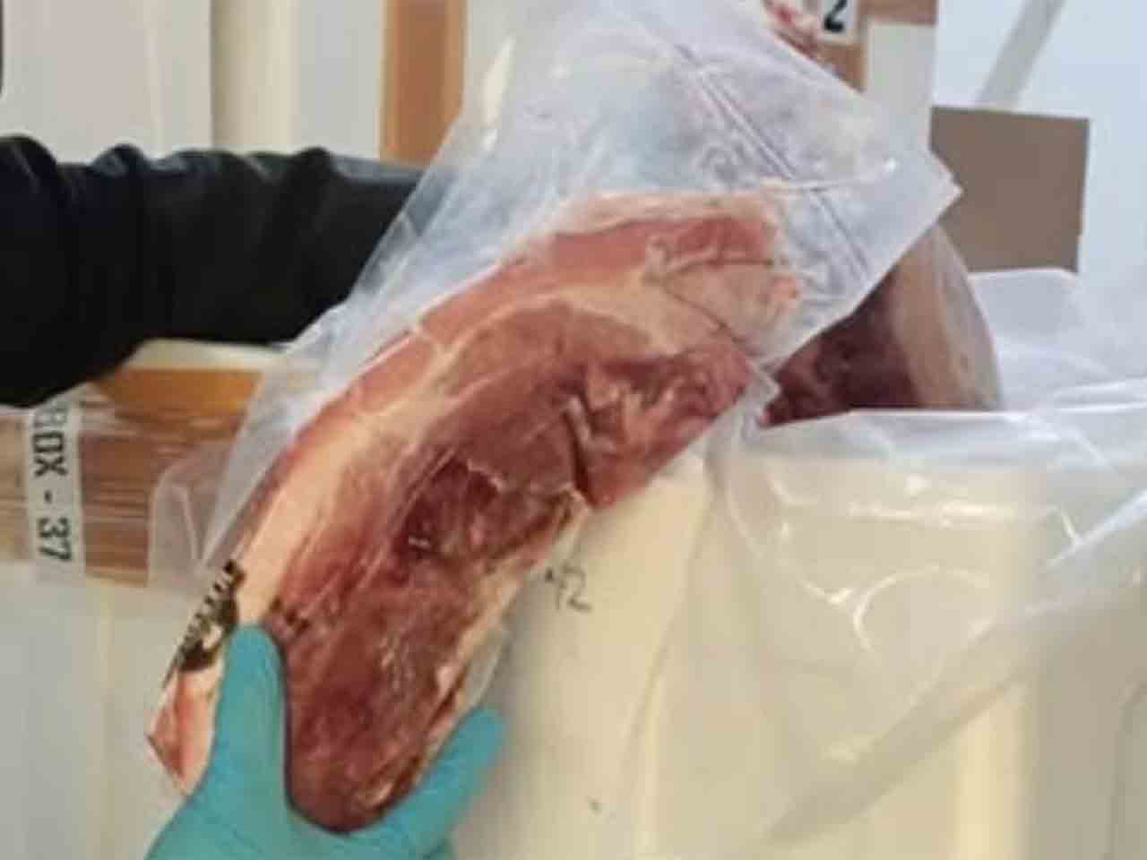 Petugas karantina juga mengecek secara detail memastikan kondisi daging berbau normal, tidak membusuk, serta tidak menunjukkan tanda-tanda penyakit lainnya seperti African Swine Fever (ASF).