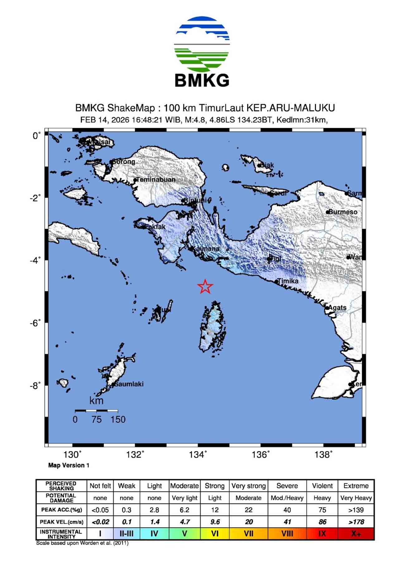 “Hasil analisis BMKG menunjukkan gempa bumi ini memiliki parameter update dengan magnitudo M4,8. Episenter gempabumi terletak pada koordinat 4,86° LS ; 134,23° BT, atau tepatnya berlokasi di laut pada jarak 100 Km arah timur laut Kepulauan Aru, Maluku pada kedalaman 31 km,” ungkap Plt Direktur Gempa Bumi dan Tsunami BMKG Rahmat Triyono dalam keterangannya yang diterima malukuterkini.com, Sabtu (14/2/2026).
