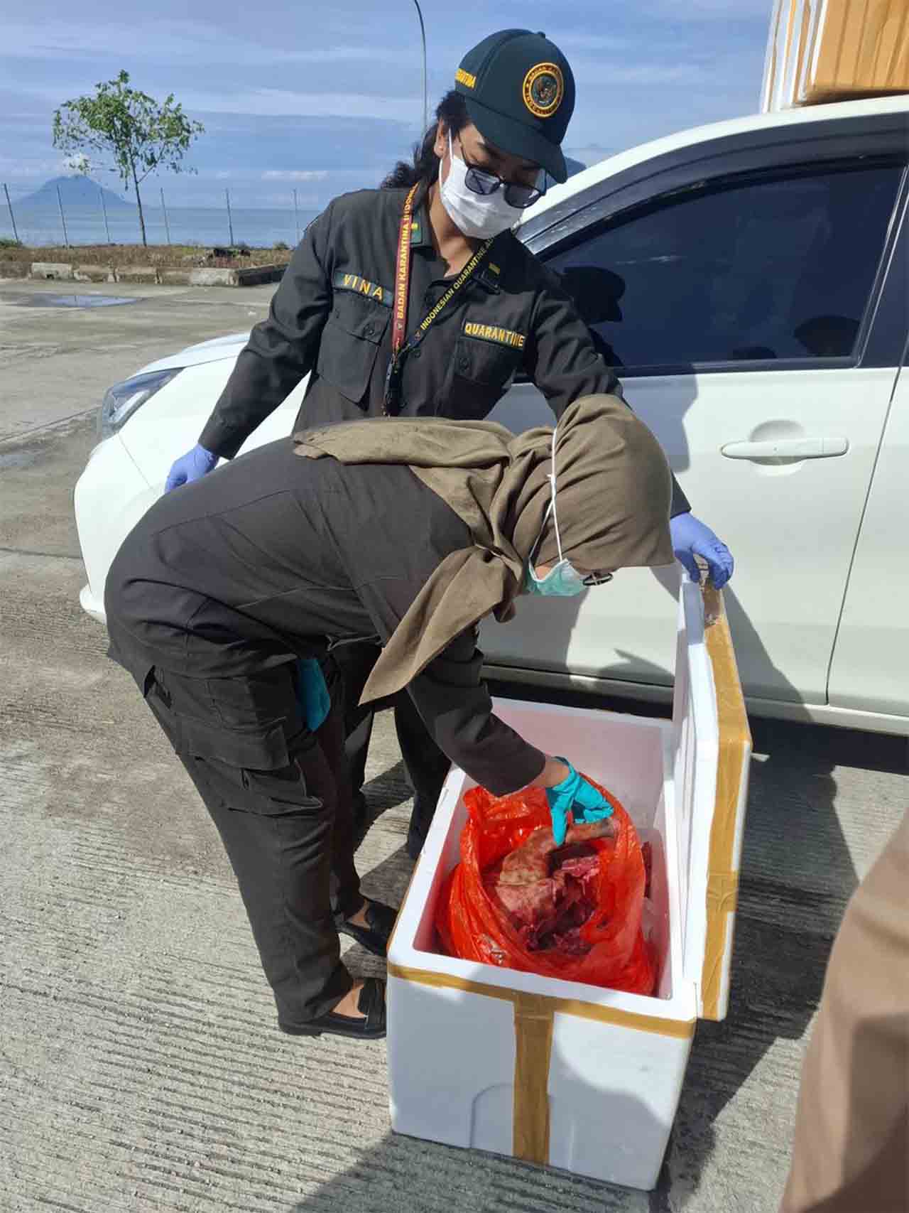 AMBON, MalukuTrkini.com – Badan Karantina Indonesia (Barantin) melalui Balai Karantina Hewan, Ikan dan Tumbuhan Maluku Utara (Karantina Maluku Utara) melakukan tindakan karantina penahanan terhadap 150 kilogram daging anjing yang diangkut menggunakan KM Cantika Lestari 99 dari Manado di Pospel pelabuhan laut Jailolo.