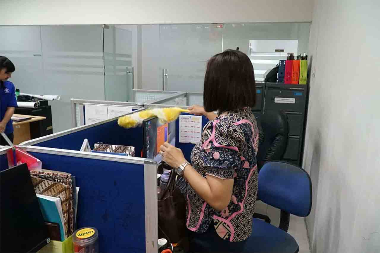 Kegiatan meliputi pembersihan ruang kerja dan area pelayanan publik, perapian meja dan lemari arsip, pemilahan serta penataan dokumen secara sistematis, hingga pengecekan sarana dan prasarana guna memastikan keamanan dan kenyamanan lingkungan kantor.