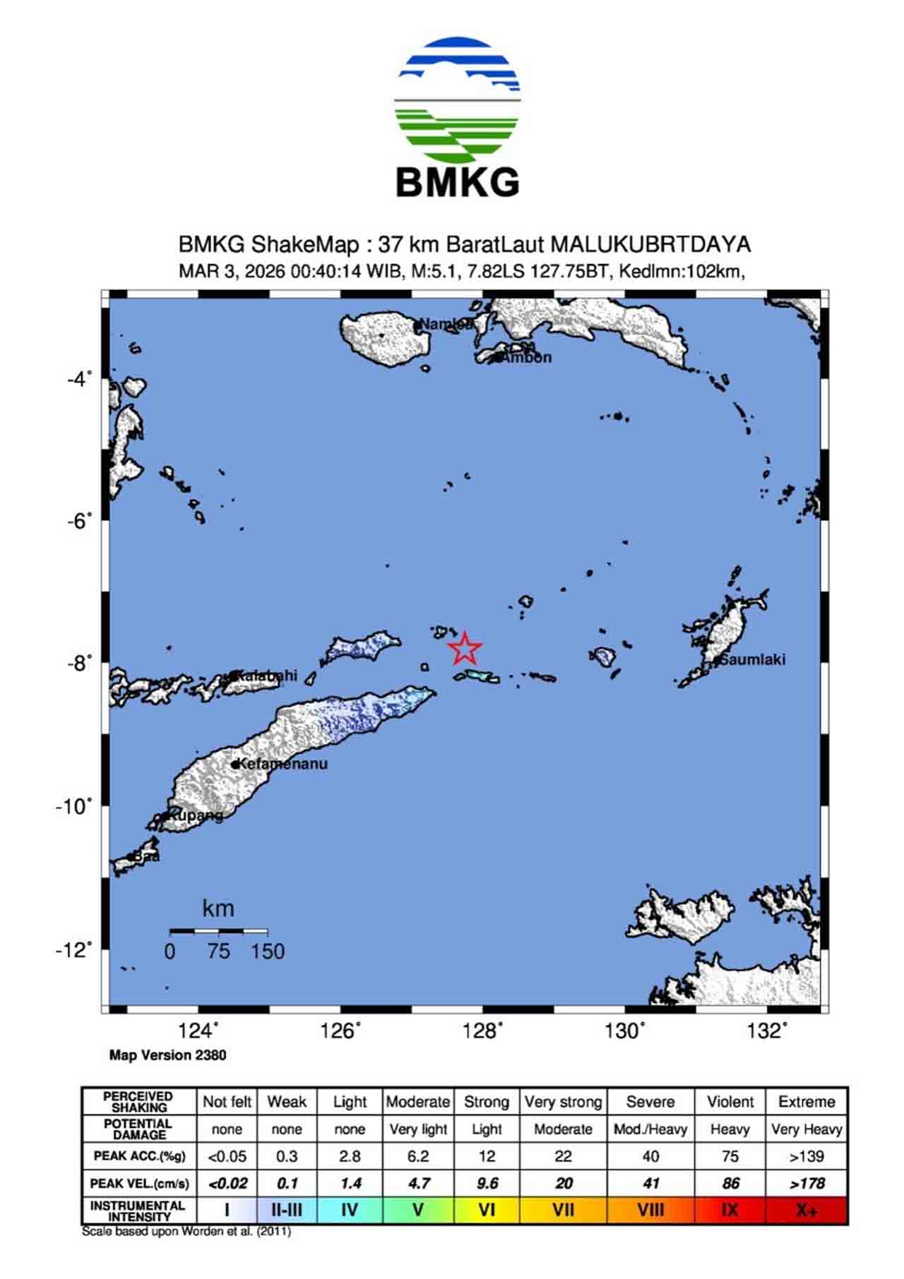“Hasil analisis BMKG menunjukkan gempa bumi ini memiliki parameter update dengan magnitudo M5,1. Episenter gempa bumi terletak pada koordinat 7,82° LS ; 127,75° BT, atau tepatnya berlokasi di laut pada jarak 37 Km arah barat laut Maluku Barat Daya, Maluku pada kedalaman 102 km,” ungkap Plt Direktur Gempa Bumi dan Tsunami BMKG, Rahmat Triyono dalam keterangannya yang diterima malukuterkini.com, Selasa (3/2/2026).