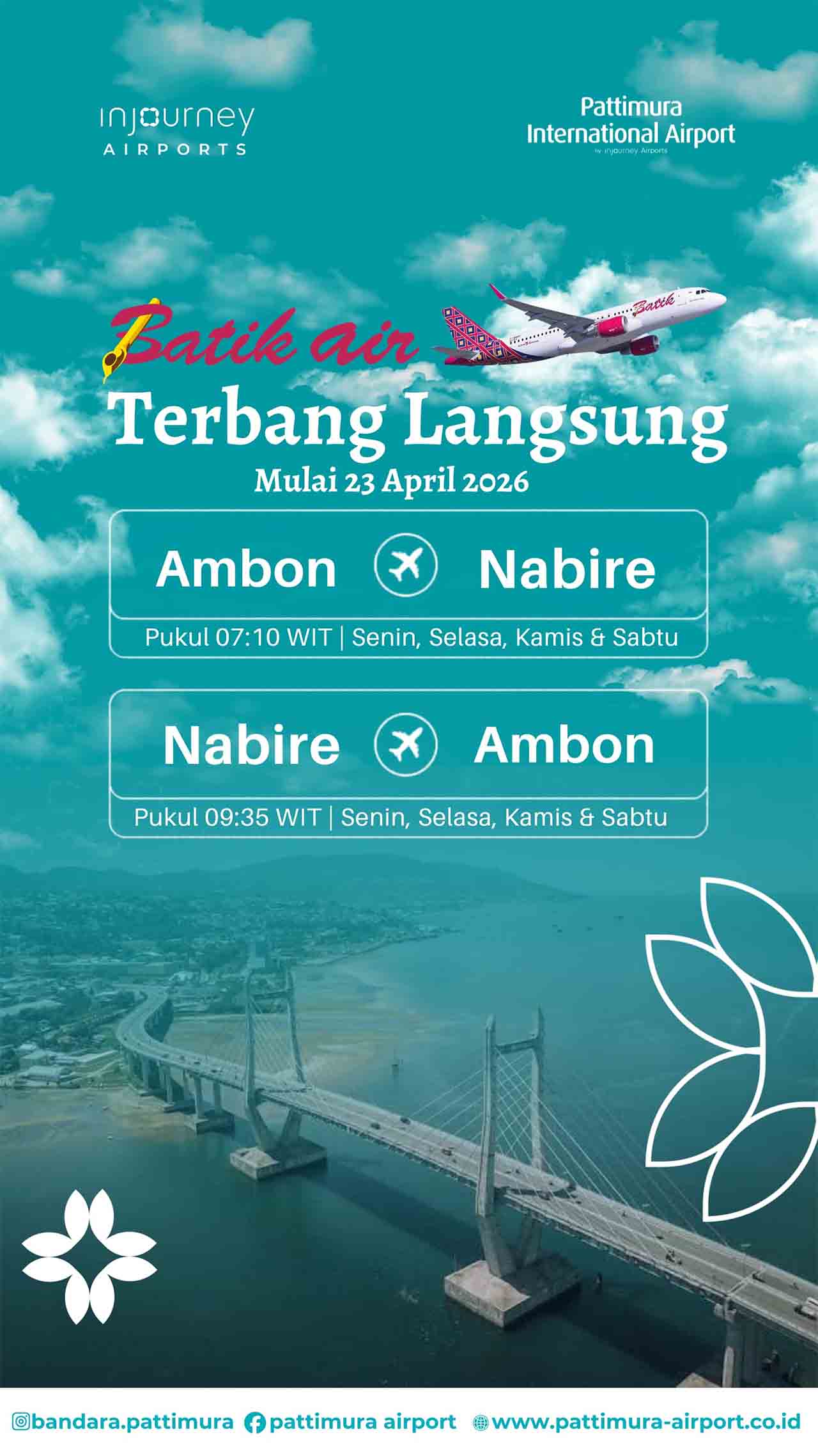Terhitung tanggal 23 April 2026 mendatang, rute penerbangan langsung (terbang langsung) Batik Air yang menghubungkan Ambon (AMQ) – Maluku dengan Nabire (NBX) – Papua Tengah akan mulai beroperasi guna memenuhi kebutuhan mobilitas masyarakat yang terus meningkat.