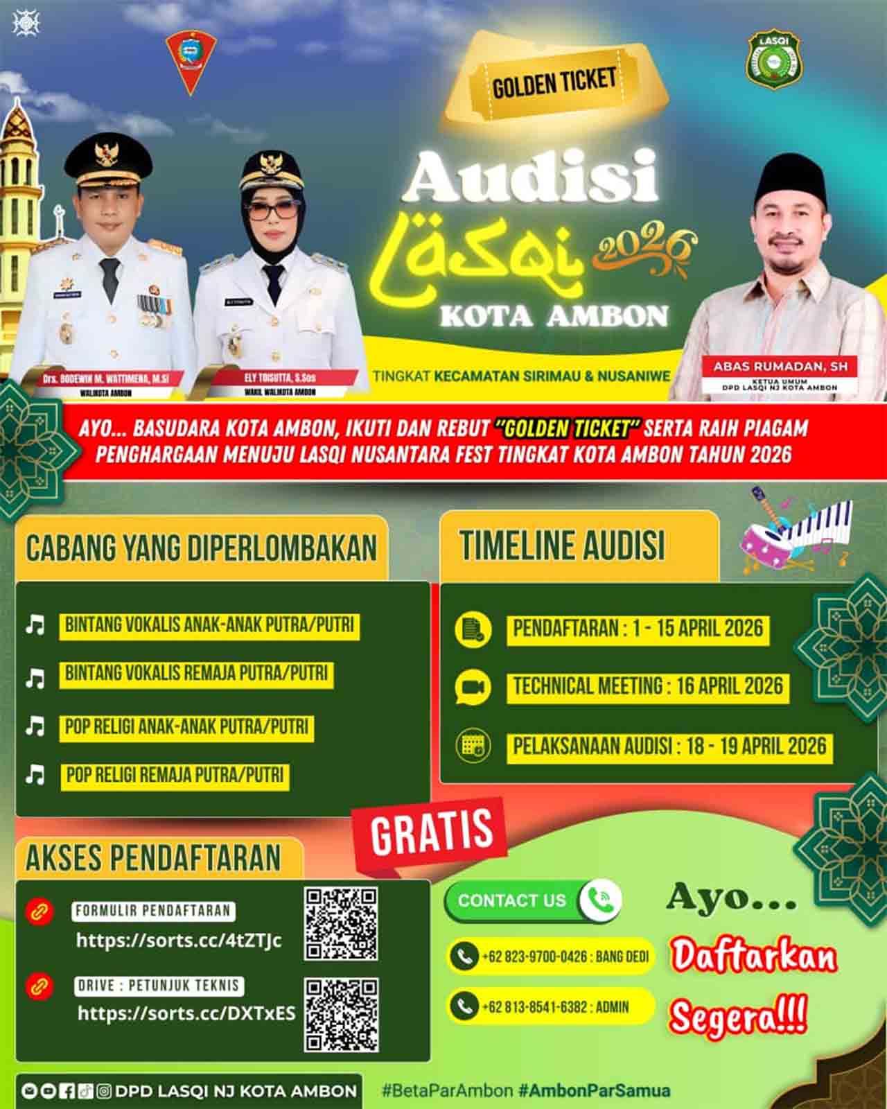 “LASQI Kota Ambon membuka audisi bagi anak-anak dan remaja yang memiliki bakat vokal untuk mengikuti seleksi pada cabang vokalis dan pop religi,” ungkap Abas di Ambon, Senin (6/4/2026).