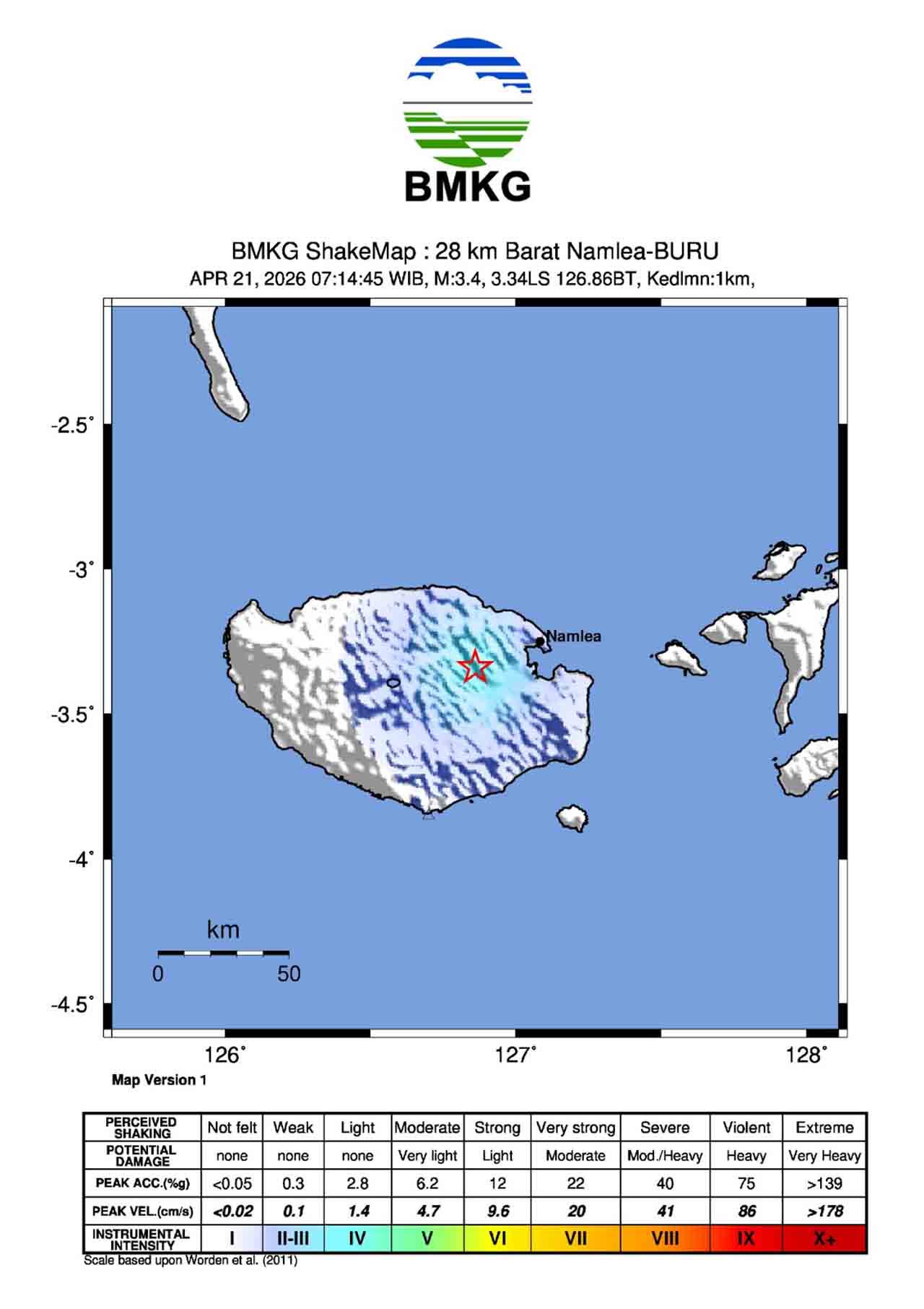 “Berdasarkan estimasi peta guncangan (shakemap) dan laporan masyarakat, gempa bumi ini menimbulkan guncangan di daerah Namlea dan Namrole dengan skala intensitas I-II MMI (getaran dirasakan oleh beberapa orang, benda-benda ringan yang digantung bergoyang),” katanya.
